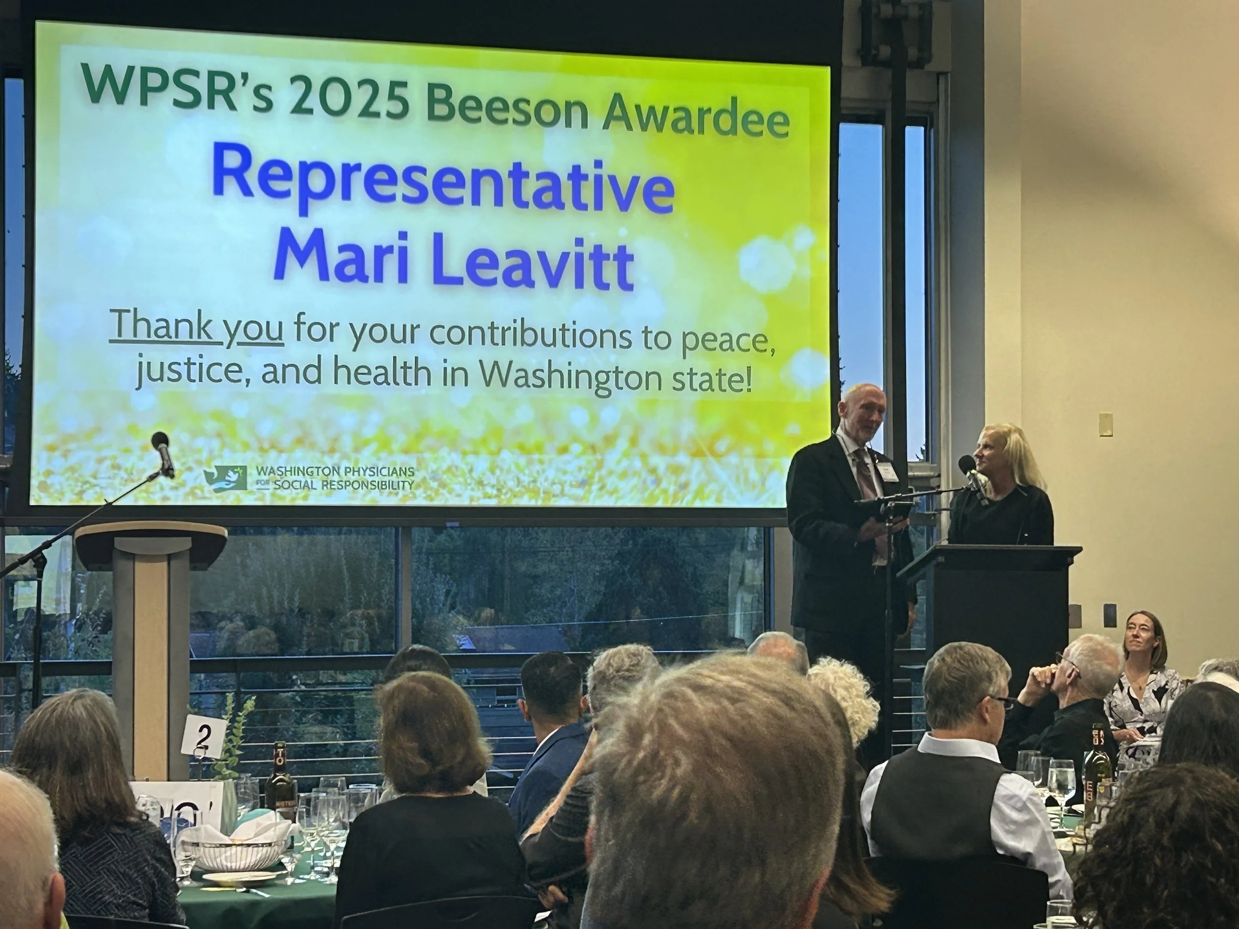 As a WPSR member I testified in support of many of health-advocacy bills she sponsored: HB 1012 Extreme Weather Protection Act, HB 1069 Mental Health Counselor Compact, HB 1763 & 1946 for behavioral health scholarships. She sponsored HB 1957 Lucas Petty Act for opioid education in schools, co-sponsored HB 1222 for hearing aids, HB 1725 capping insulin costs, HB 1888 for telemedicine, HB 1931 addressing violence against health care workers, HB 2321 against youth access to age 21+ products. She is a strong advocate for individuals with developmental disability to access services and care. This year, she co-sponsored HB 1837 to improve Cascades train performance, as the best climate & health public transport choice. She’s a resident of the 28th Legislative District for 35 years, & State Rep since 2019. She lives in University Place with her pets, children, & husband, Dr Drew Leavitt, here tonight (stand up Drew)—she is so busy, you’ve likely seen her more tonite than the past month? Please welcome Dr Mari Leavitt, our 2025 Beason award honoree!
